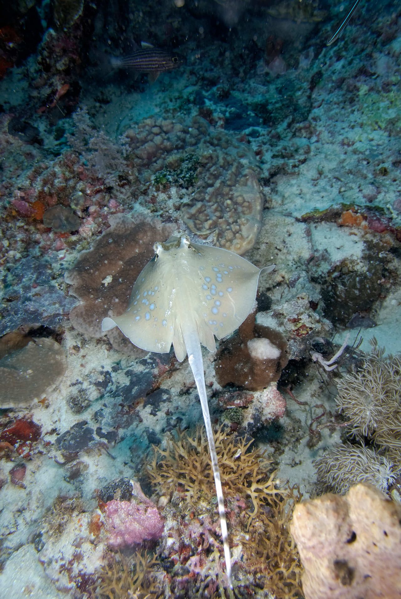 サメと言えばあの鰓が私的には特徴的なものだと思っていますが、確かにエイの下側にもありますね。さて、ダイバーが憧れるマンタ(Giant Manta Ray)ですが、実は彼らもエイの仲間なのです。平べったくて泳ぐ姿が飛んでいるように見えるあたりも両者は似ていますよね。マンタには和名が”オニイトマキエイ”と、エイが付いているものもいます。エイはマンタも含め、約530種が知られています。世界中の海洋の暖海域から極域まで広く分布し、一部は淡水にも適応しています。海水のみの魚かと思っていましたが、淡水にもいるんですね。淡水にいるとは、まったく想像出来ませんが。ちなみに淡水エイは形が面白いことや、模様や色によって多くのバリエーションが存在することから鑑賞魚としての人気が高いそうです。エイの多くは卵胎生で(メスがお腹の中で卵を育て、体内で孵化させて子を産む)尾の棘に毒を持つ種類もいます。サメの一部の系統から底生生活に適応して進化した系統のひとつと考えられていますが、トビエイ(マンタはトビエイの仲間)のように二次的に遊泳生活に戻ったものもいます。