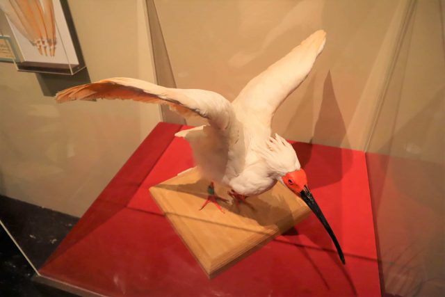 ペリカン目トキ科です。英語ではIbisで、漢字では朱鷺と書きます。かつて国境など関係なく、東アジアの空を飛んでいました。くちばしは黒く、先端が赤いです。全身は白っぽいですが、春から夏にかけて翼の下側は朱色がかったピンク色になり、脚も頭と同様に朱色です。非常に珍しい羽色変化をおこなう鳥としても有名なトキです。普段は白色で、繁殖期にはいると灰色に変化、繁殖期が終わるとまた白色に戻ります。オスとメスで性格の違いが大きく、オスは食欲旺盛で攻撃的、メスは食欲が少なくおとなしいと言われています。
